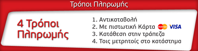 Πληρώστε το αντίτιμο της παραγγελίας τοις μετρητοίς στην εταιρεία μεταφοράς, κατά την στιγμή της παραλαβής των προϊόντων. Το κόστος της αντικαταβολής είναι 1,90€ (επιπλέον των εξόδων αποστολής).