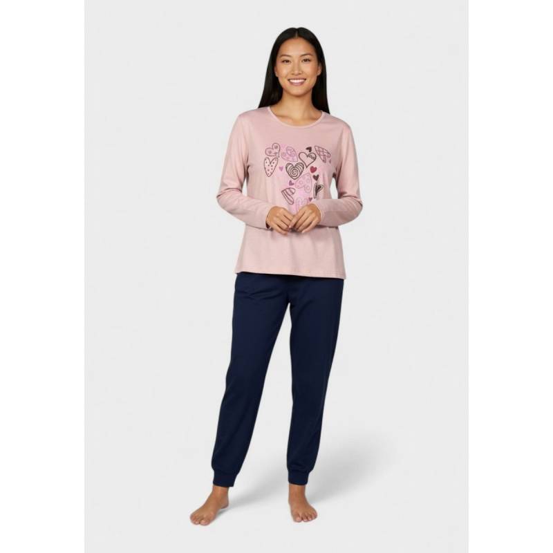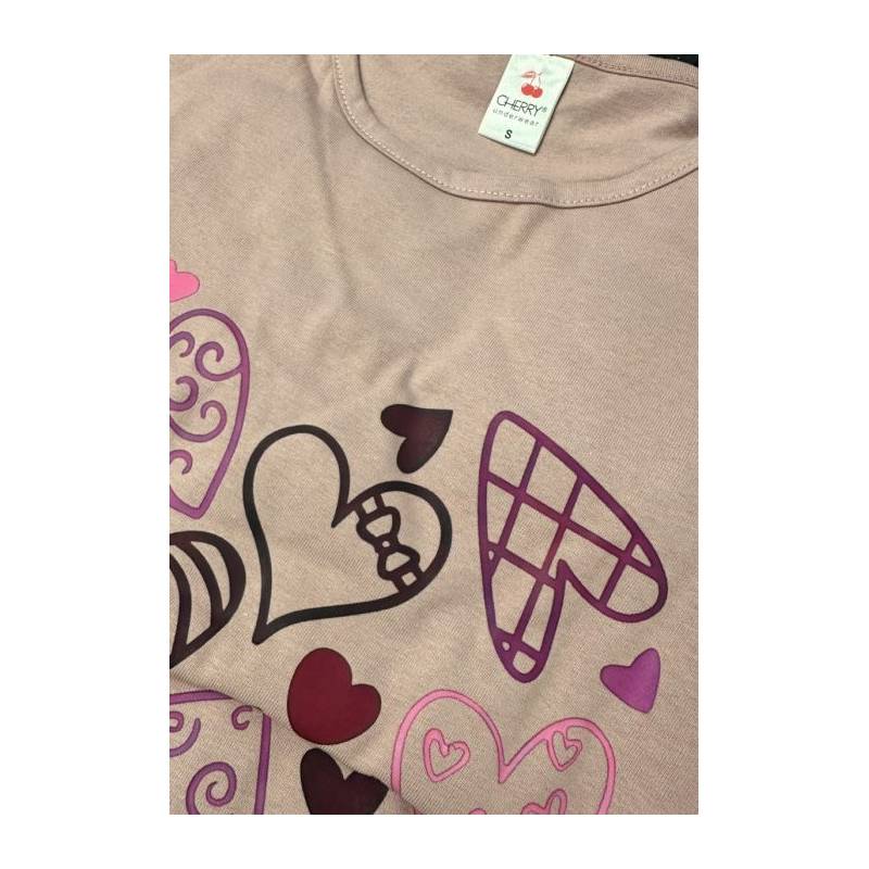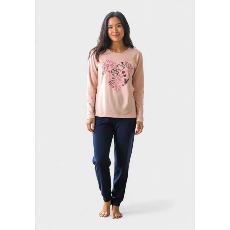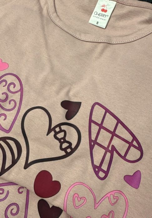 Η γυναικεία βαμβακερή πιτζάμα Cherry Underwear Blush Hearts είναι η τέλεια επιλογή για cozy βράδια γεμάτα ρομαντική διάθεση. Η μπλούζα σε απαλό ροζ (blush pink) με μακρύ μανίκι ξεχωρίζει με το παιχνιδιάρικο print καρδιών σε αποχρώσεις του μωβ, του ροζ και του μπορντό, ενώ το σκούρο μπλε παντελόνι ολοκληρώνει το σετ με κομψότητα και άνεση.