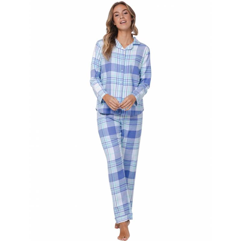 Οι πιτζάμες είναι μπλε με καρό σχέδιο. Το πάνω μέρος έχει μακριά μανίκια, κλείσιμο με κουμπιά και γιακά. Μια διακριτική λεπτομέρεια είναι το ανοιχτό μπλε ριγέ κατά μήκος του ντεκολτέ και το κλείσιμο με κουμπιά. Το μακρύ παντελόνι έχει ίσια γραμμή και ελαστική μέση με κορδόνι για βέλτιστη και άνετη εφαρμογή.
