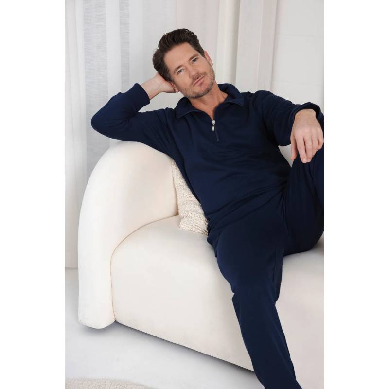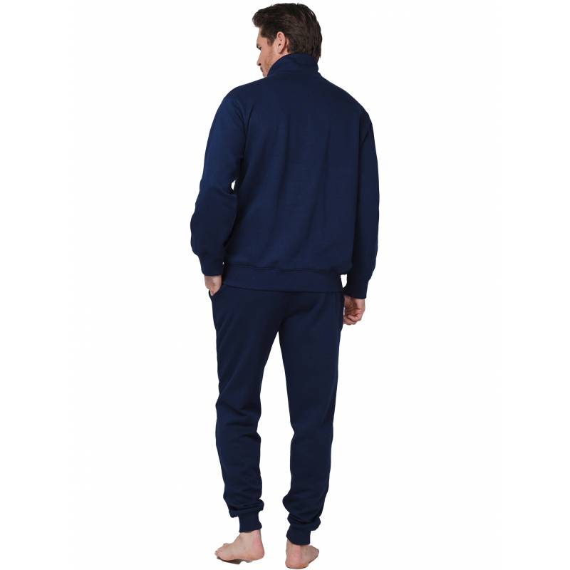 Η φόρμα δύο τεμαχίων αποτελείται από ένα πουλόβερ και ένα μακρύ παντελόνι σε μονόχρωμο σκούρο μπλε χρώμα. Το πουλόβερ έχει μακριά μανίκια, ψηλό λαιμό με φερμουάρ, μανσέτες και στρίφωμα. Το μακρύ παντελόνι έχει ελαστική ζώνη με κορδόνι περίσφιξης για βέλτιστη εφαρμογή. Διαθέτει επίσης βαθιές πλαϊνές τσέπες και μανσέτες.