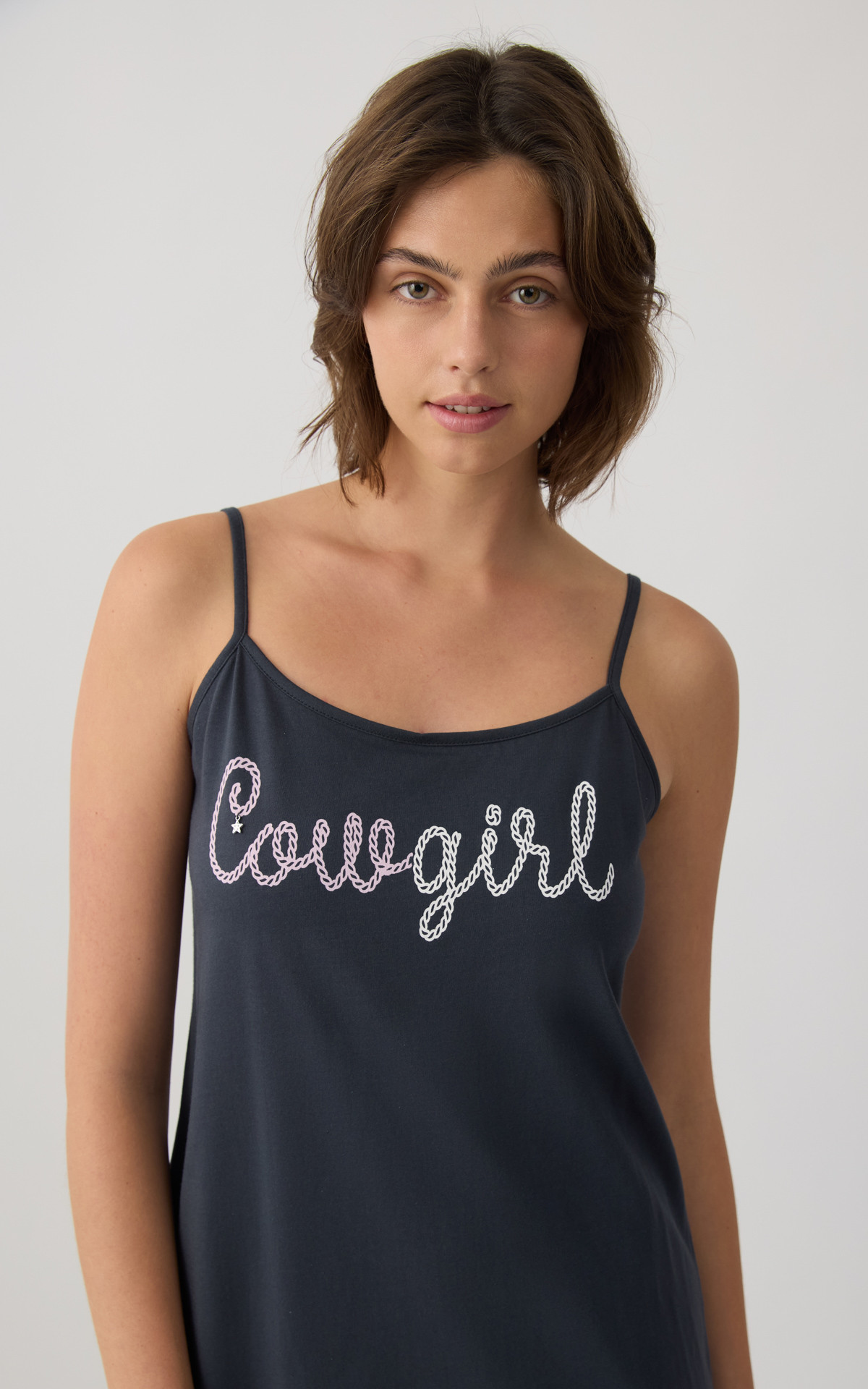 • Κοντή νυχτικιά με λεπτές μπριτέλες και μοντέρνο τύπωμα στο μπροστινό μέρος που χαρίζει νεανικό και θηλυκό χαρακτήρα. Κατασκευασμένη από 100% βαμβακερό ύφασμα εξαιρετικής ποιότητας, προσφέρει απαλή αίσθηση και δροσερή άνεση κατά τη διάρκεια της νύχτας.